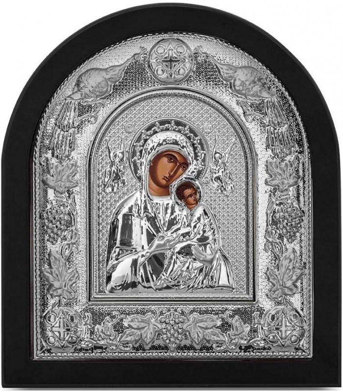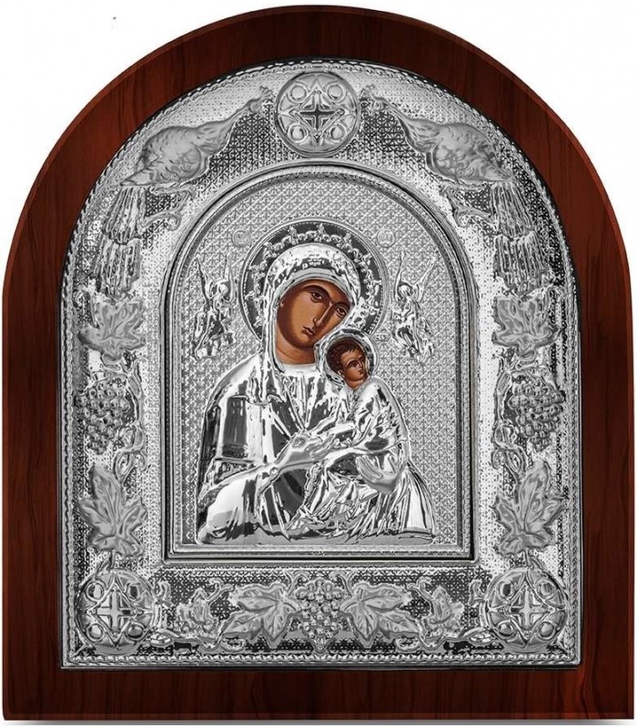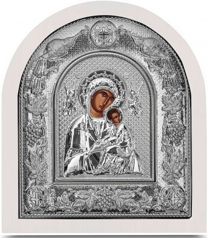 Ακριβές αντίγραφο βυζαντινής εικόνας κατασκευασμένη με επίστρωση άργυρου 950° επί συνθετικού ή μεταλλικού υποστρώματος, επίχρυση διακόσμηση και φιλοτεχνημένη με αυθεντική μεταξοτυπία από την εταιρεία Prime Silver. Έχει υποστεί ειδική επεξεργασία για να παραμένει αναλλοίωτη στο πέρασμα του χρόνου.