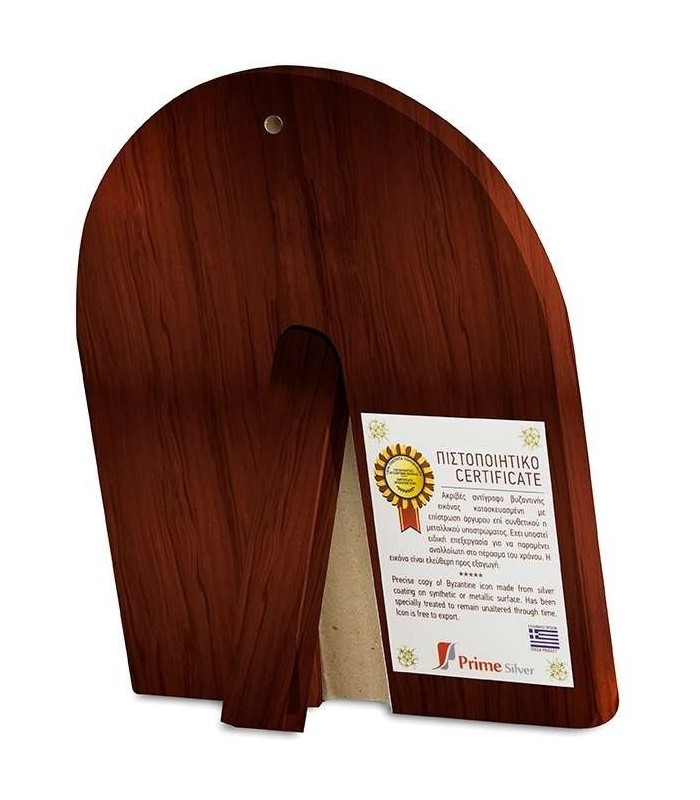 Ακριβές αντίγραφο βυζαντινής εικόνας κατασκευασμένη με επίστρωση άργυρου 950° επί συνθετικού ή μεταλλικού υποστρώματος, επίχρυση διακόσμηση και φιλοτεχνημένη με αυθεντική μεταξοτυπία από την εταιρεία Prime Silver. Έχει υποστεί ειδική επεξεργασία για να παραμένει αναλλοίωτη στο πέρασμα του χρόνου.
