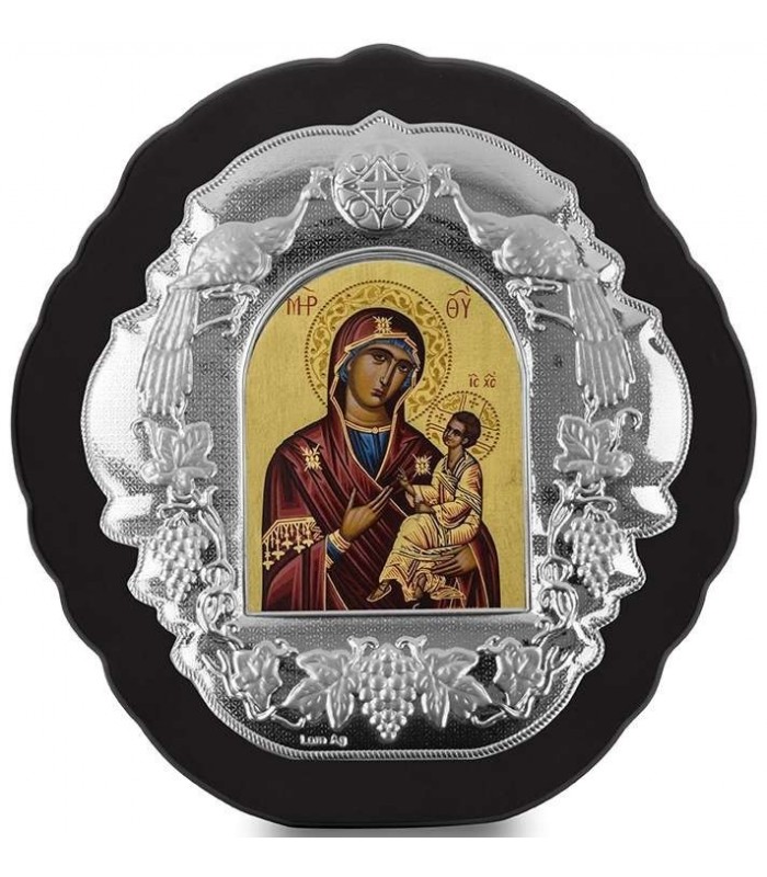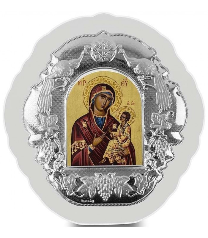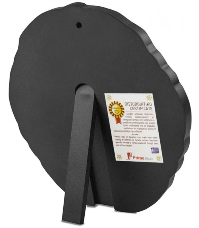 Ακριβές αντίγραφο βυζαντινής εικόνας κατασκευασμένη με επίστρωση άργυρου 950° επί συνθετικού ή μεταλλικού υποστρώματος, επίχρυση διακόσμηση και φιλοτεχνημένη με αυθεντική μεταξοτυπία από την εταιρεία Prime Silver. Έχει υποστεί ειδική επεξεργασία για να παραμένει αναλλοίωτη στο πέρασμα του χρόνου.