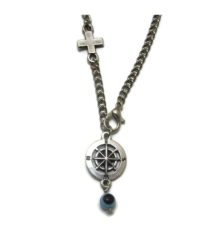 Φυλαχτό αυτοκινήτου πυξίδα με ματάκι και σταυρό πάνω στην αλυσίδα και κούμπωμα.