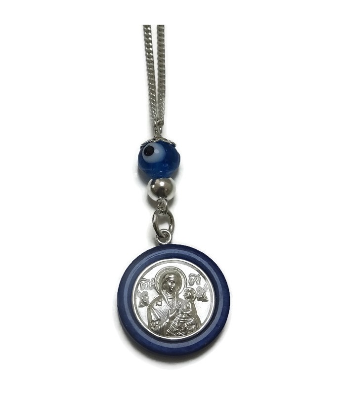 Φυλαχτό αυτοκινήτου με εικονάκι διπλής όψεως, Άγιος Χριστόφορος και Παναγία και Χριστό από ασήμι 925, στεφάνι από μπλε plexiglass, σε ασημένια αλυσίδα με κούμπωμα και μάτι murano.