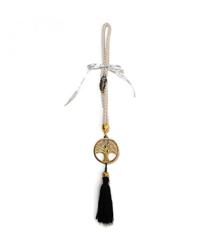 Γούρι κρεμαστό δέντρο της ζωής, σε μπεζ κορδόνι και μαύρη φούντα και επιχρυσωμένο φτερό με ματάκι με σμάλτο. Διάσταση περίπου 53 cm.