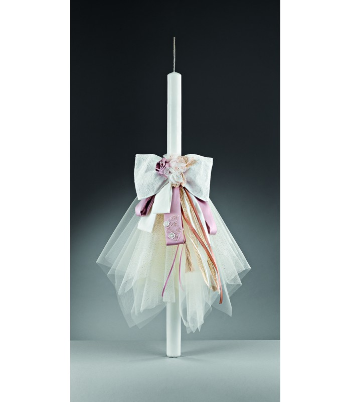 Λαμπάδα βάφτισης με λουλούδια υφασμάτινα για κορίτσι, με δαντέλα και τούλι.