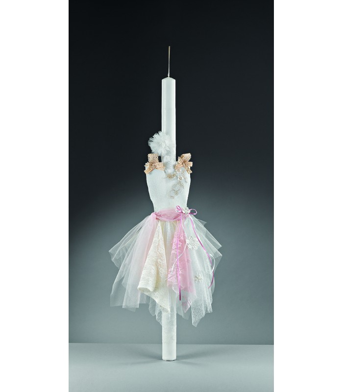 Λαμπάδα βάφτισης φόρεμα για κορίτσι, με δαντέλα, φιογκάκια και τούλι.