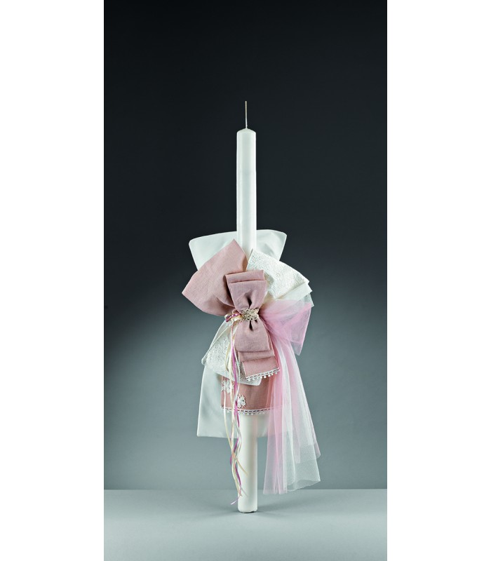 Λαμπάδα βάφτισης για κορίτσι, με δαντέλα, υφάσματα και τούλι.