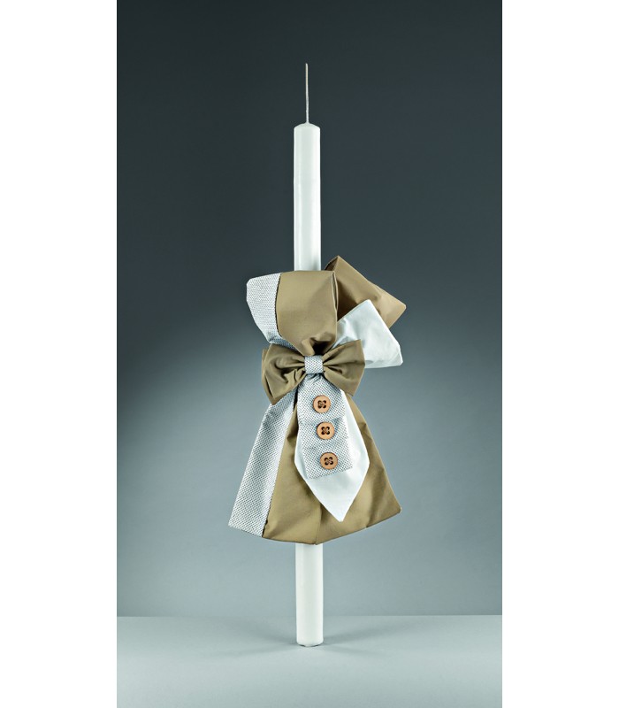 Λαμπάδα βάφτισης με ξύλινα κουμπιά για αγόρι, με υφάσματα και φιόγκο.