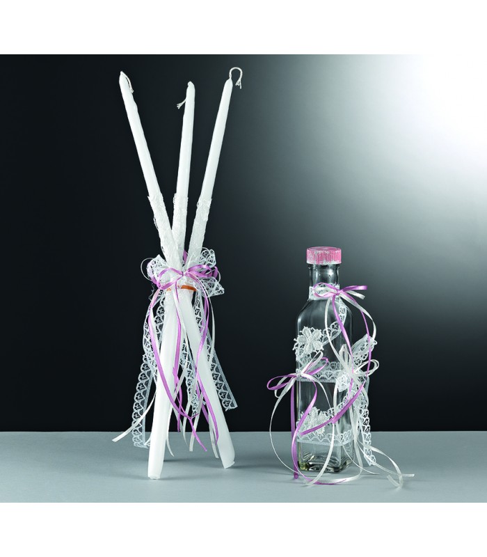Λαδοσέτ για κορίτσι, με δαντέλα και κορδέλες. Το σετ περιλαμβάνει 3 κεριά, ένα πουγκί με σαπούνι και ένα γυάλινο μπουκαλάκι για το λάδι.