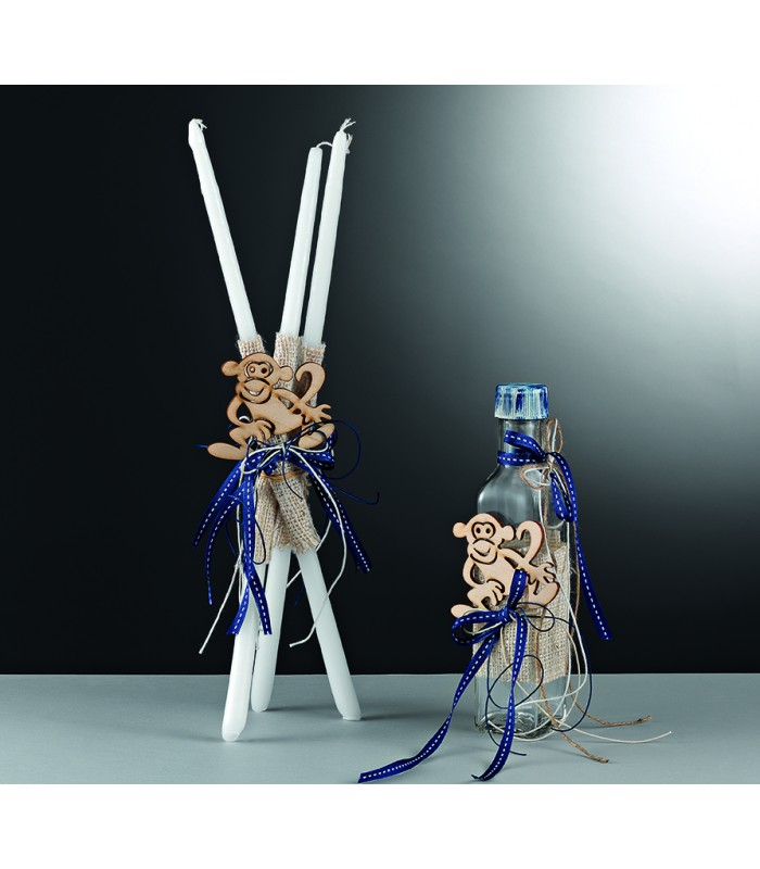 Λαδοσέτ μεξύλινη μαϊμού για αγόρι, με λινάτσα και κορδέλες. Το σετ περιλαμβάνει 3 κεριά και ένα γυάλινο μπουκαλάκι για το λάδι.