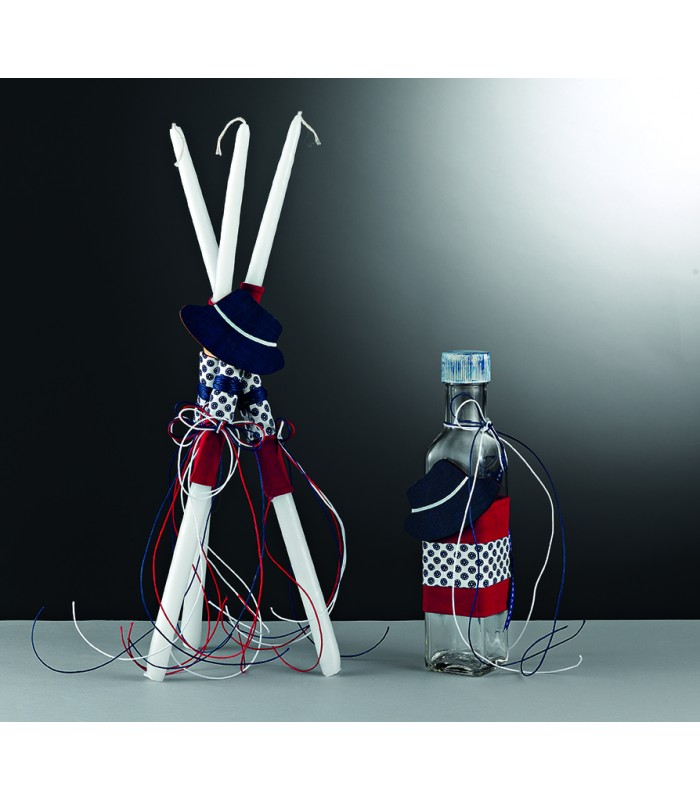 Λαδοσέτ με ξύλινο καπέλο για αγόρι. Το σετ περιλαμβάνει 3 κεριά και ένα γυάλινο μπουκαλάκι για το λάδι.