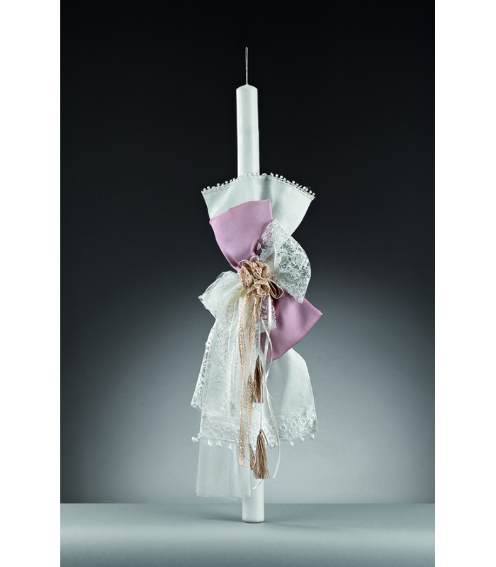 Λαμπάδα βάφτισης για κορίτσι, με δαντέλα και ύφασμα.