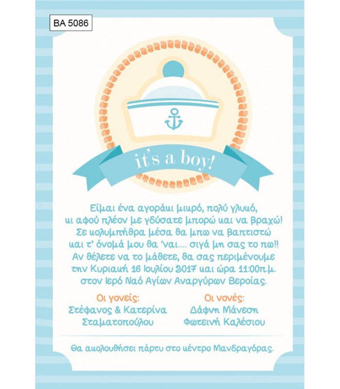Προσκλητήριο it's baby boy για αγόρι, μαζί με φάκελο σε χρώμα της επιλογής σας διάστασης 15×10.5 cm. Το χαρτί του προσκλητηρίου έχει βάρος 220gr/τ.μ.Το χρώμα της εκτύπωσης και η γραμματοσειρά θα είναι όπως το παραπάνω δείγμα. Στη τιμή περιλαμβάνεται το προσκλητήριο μαζί με το φάκελο.