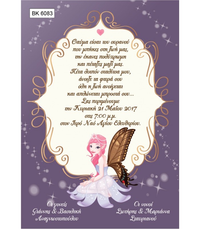 Προσκλητήριο νεράιδα για κορίτσι, μαζί με φάκελο σε χρώμα της επιλογής σας διάστασης 15×10.5 cm. Το χαρτί του προσκλητηρίου έχει βάρος 220gr/τ.μ.Το χρώμα της εκτύπωσης και η γραμματοσειρά θα είναι όπως το παραπάνω δείγμα. Στη τιμή περιλαμβάνεται το προσκλητήριο μαζί με το φάκελο.