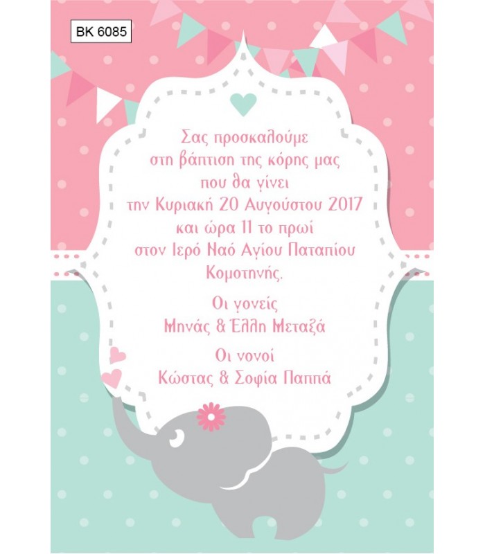 Προσκλητήριο ελεφαντάκι για κορίτσι, μαζί με φάκελο σε χρώμα της επιλογής σας διάστασης 15×10.5 cm. Το χαρτί του προσκλητηρίου έχει βάρος 220gr/τ.μ.Το χρώμα της εκτύπωσης και η γραμματοσειρά θα είναι όπως το παραπάνω δείγμα. Στη τιμή περιλαμβάνεται το προσκλητήριο μαζί με το φάκελο.