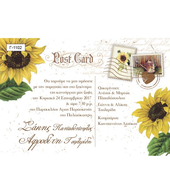 Προσκλητήριο γάμου Postcard , μαζί με φάκελο σε χρώμα της επιλογής σας διάστασης 15×10.5 cm. Το χαρτί του προσκλητηρίου έχει βάρος 220gr/τ.μ.Το χρώμα της εκτύπωσης και η γραμματοσειρά θα είναι όπως το παραπάνω δείγμα. Στη τιμή περιλαμβάνεται το προσκλητήριο μαζί με το φάκελο.