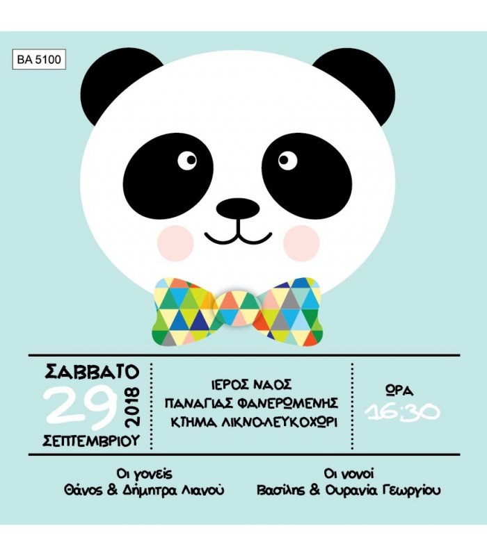 Προσκλητήριο βάπτισης για αγόρι με θέμα πάντα. Η κάρτα του προσκλητηρίου είναι τυπωμένη σε λευκό ματ χαρτί 220γρ. Το προσκλητήριο διαθέτει φάκελο διάστασης 15X15cm σε χρώμα της επιλογής σας.