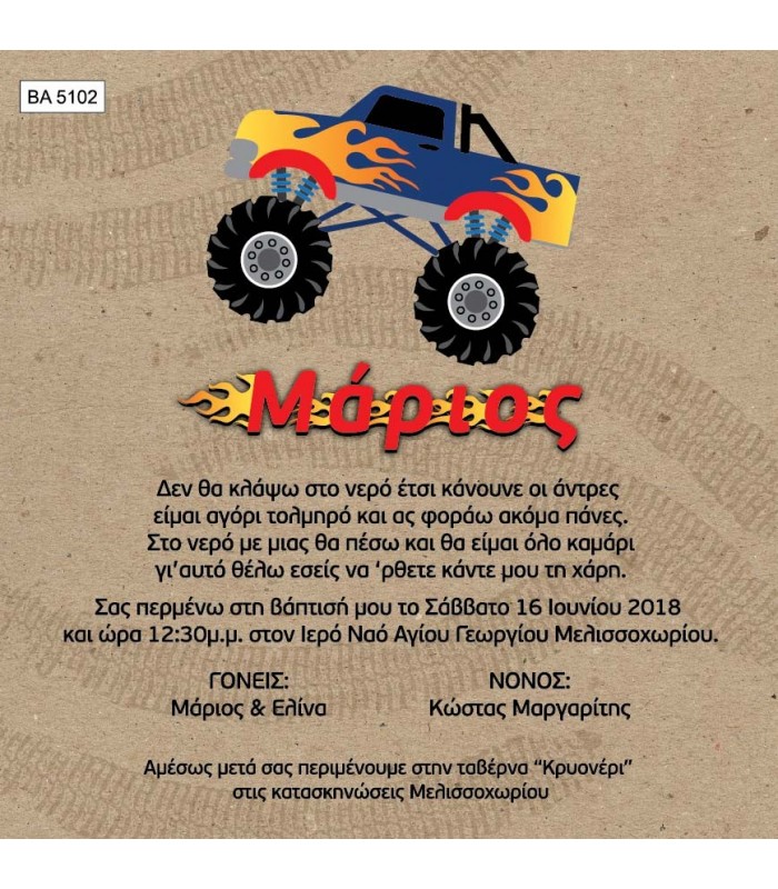 Προσκλητήριο βάπτισης για αγόρι με αυτοκίνητο. Η κάρτα του προσκλητηρίου είναι τυπωμένη σε λευκό ματ χαρτί 220γρ. Το προσκλητήριο διαθέτει φάκελο διάστασης 15X15cm σε χρώμα της επιλογής σας.