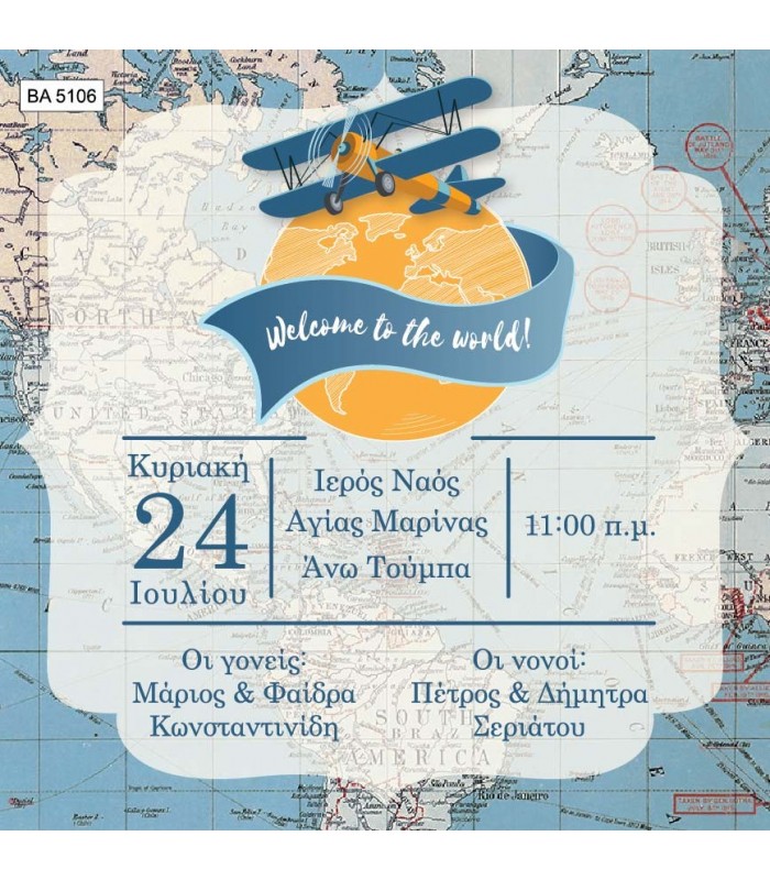 Προσκλητήριο βάπτισης για αγόρι ταξίδι. Η κάρτα του προσκλητηρίου είναι τυπωμένη σε λευκό ματ χαρτί 220γρ. Το προσκλητήριο διαθέτει φάκελο διάστασης 15X15cm σε χρώμα της επιλογής σας.