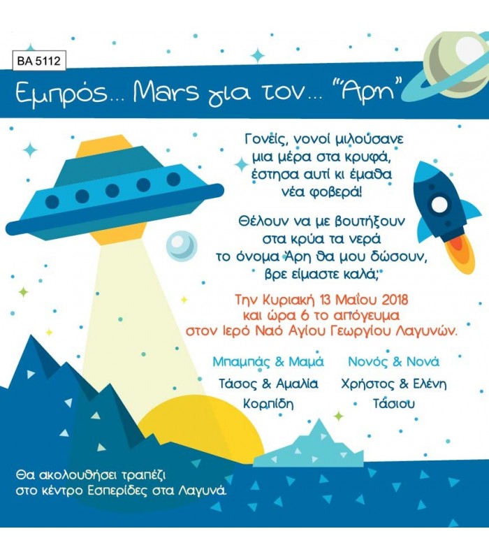 Προσκλητήριο βάπτισης για αγόρι διάστημα. Η κάρτα του προσκλητηρίου είναι τυπωμένη σε λευκό ματ χαρτί 220γρ. Το προσκλητήριο διαθέτει φάκελο διάστασης 15X15cm σε χρώμα της επιλογής σας.