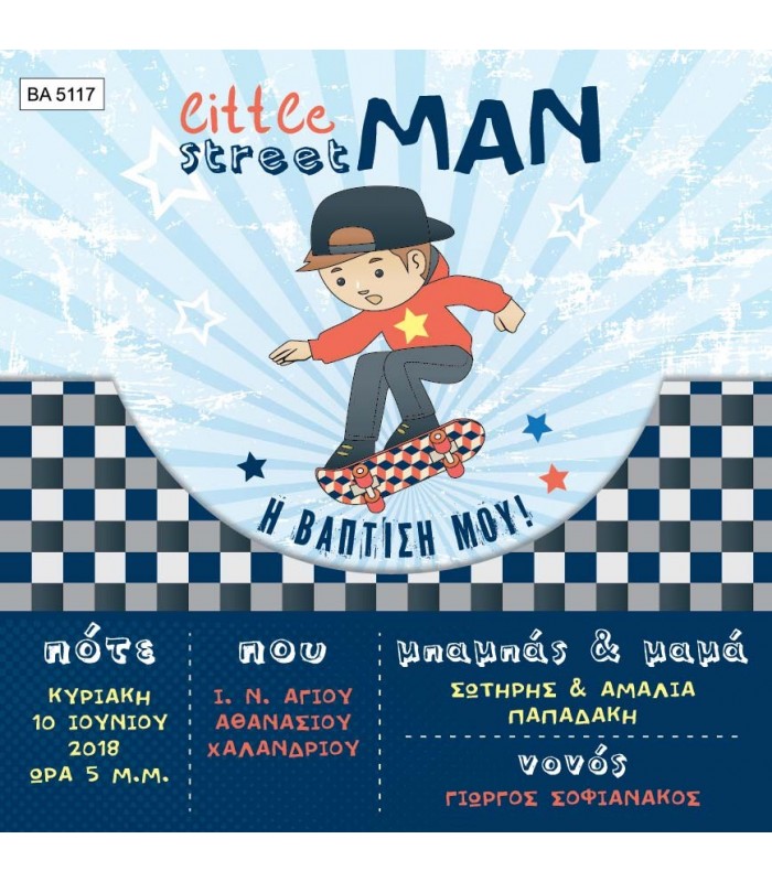 Προσκλητήριο βάπτισης για αγόρι skateboard. Η κάρτα του προσκλητηρίου είναι τυπωμένη σε λευκό ματ χαρτί 220γρ. Το προσκλητήριο διαθέτει φάκελο διάστασης 15X15cm σε χρώμα της επιλογής σας.