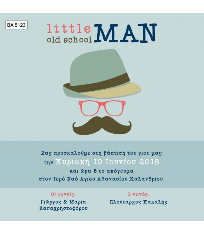Προσκλητήριο βάπτισης για αγόρι με θέμα little man. Η κάρτα του προσκλητηρίου είναι τυπωμένη σε λευκό ματ χαρτί 220γρ. Το προσκλητήριο διαθέτει φάκελο διάστασης 15X15cm σε χρώμα της επιλογής σας.