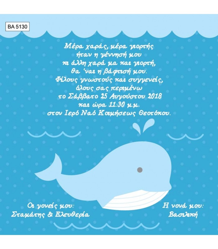 Προσκλητήριο βάπτισης φάλαινα για αγόρι. Η κάρτα του προσκλητηρίου είναι τυπωμένη σε λευκό ματ χαρτί 220γρ. Το προσκλητήριο διαθέτει φάκελο διάστασης 15X15cm σε χρώμα της επιλογής σας.
