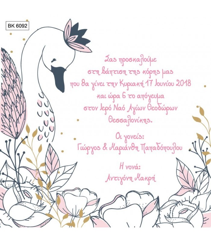 Προσκλητήριο βάπτισης κύκνος για κορίτσι. Η κάρτα του προσκλητηρίου είναι τυπωμένη σε λευκό ματ χαρτί 220γρ. Το προσκλητήριο διαθέτει φάκελο διάστασης 15X15cm σε χρώμα της επιλογής σας.