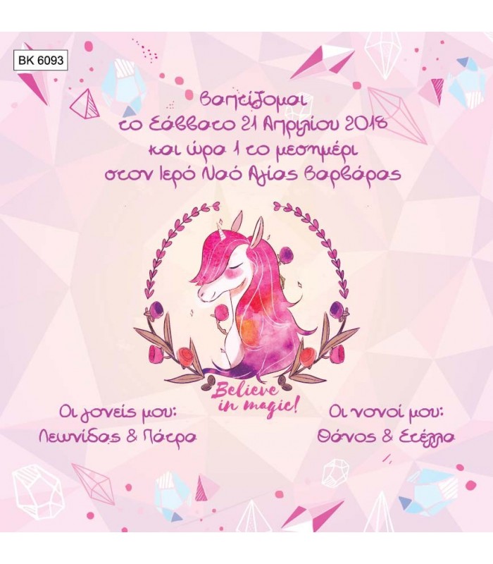Προσκλητήριο βάπτισης μονόκερος για κορίτσι. Η κάρτα του προσκλητηρίου είναι τυπωμένη σε λευκό ματ χαρτί 220γρ. Το προσκλητήριο διαθέτει φάκελο διάστασης 15X15cm σε χρώμα της επιλογής σας.