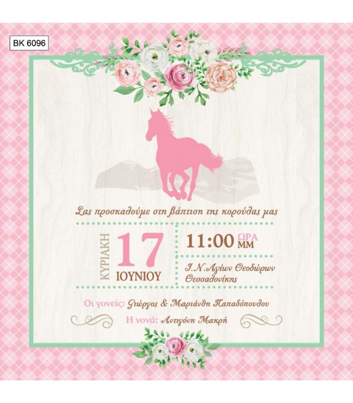 Προσκλητήριο βάπτισης άλογο για κορίτσι. Η κάρτα του προσκλητηρίου είναι τυπωμένη σε λευκό ματ χαρτί 220γρ. Το προσκλητήριο διαθέτει φάκελο διάστασης 15X15cm σε χρώμα της επιλογής σας.