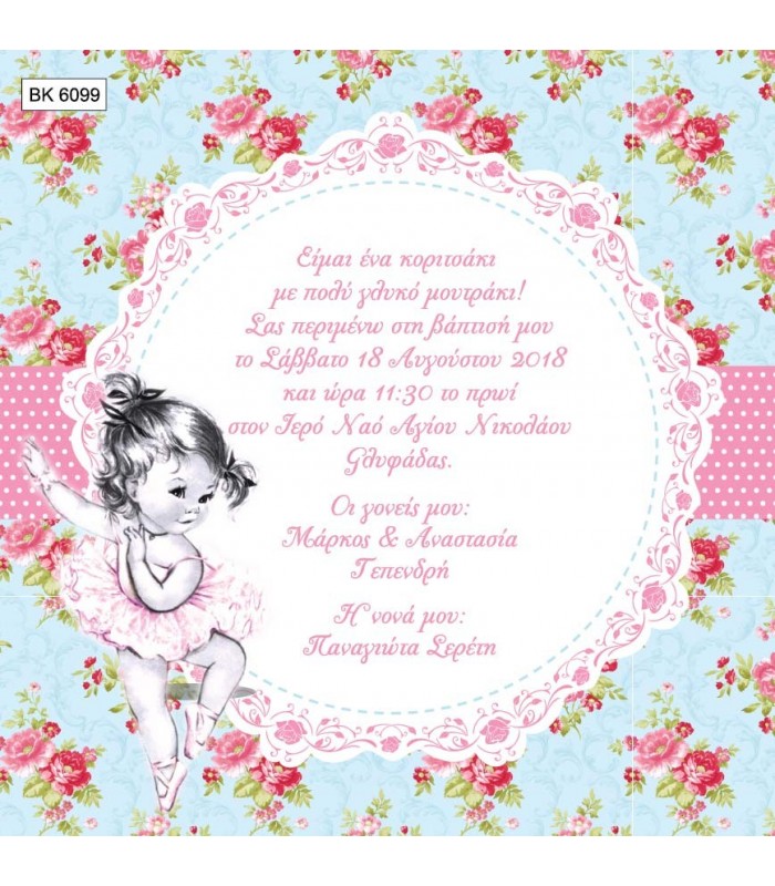 Προσκλητήριο βάπτιση για κορίτσι. Η κάρτα του προσκλητηρίου είναι τυπωμένη σε λευκό ματ χαρτί 220γρ. Το προσκλητήριο διαθέτει φάκελο διάστασης 15X15cm σε χρώμα της επιλογής σας.