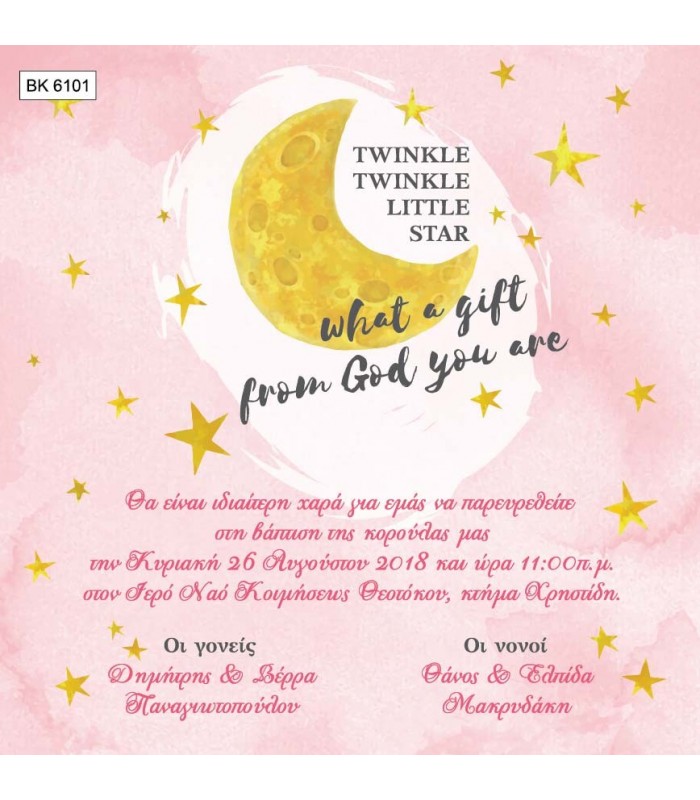 Προσκλητήριο βάπτισης φεγγαράκι για κορίτσι. Η κάρτα του προσκλητηρίου είναι τυπωμένη σε λευκό ματ χαρτί 220γρ. Το προσκλητήριο διαθέτει φάκελο διάστασης 15X15cm σε χρώμα της επιλογής σας.