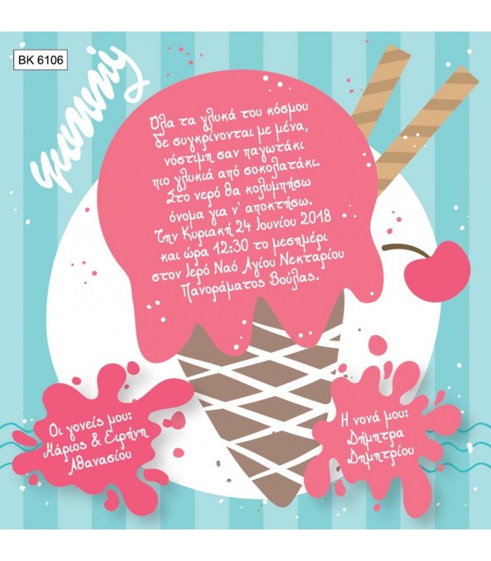 Προσκλητήριο βάπτισης παγωτο για κορίτσι. Η κάρτα του προσκλητηρίου είναι τυπωμένη σε λευκό ματ χαρτί 220γρ. Το προσκλητήριο διαθέτει φάκελο διάστασης 15X15cm σε χρώμα της επιλογής σας.