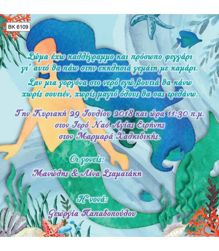 Προσκλητήριο βάπτισης γοργόνα για κορίτσι. Η κάρτα του προσκλητηρίου είναι τυπωμένη σε λευκό ματ χαρτί 220γρ. Το προσκλητήριο διαθέτει φάκελο διάστασης 15X15cm σε χρώμα της επιλογής σας.