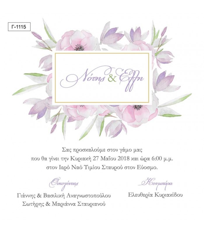 Προσκλητήριο γάμου, η κάρτα του προσκλητηρίου είναι τυπωμένη σε υπόλευκο ματ χαρτί 260γρ. Το προσκλητήριο διαθέτει φάκελο διάστασης 15X15cm σε χαρτί της επιλογής σας από τους αναγραφόμενους κωδικούς της εικόνας.