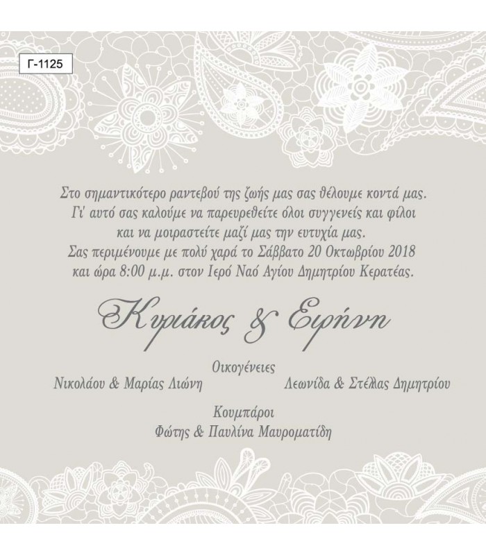 Προσκλητήριο γάμου, η κάρτα του προσκλητηρίου είναι τυπωμένη σε υπόλευκο ματ χαρτί 260γρ. Το προσκλητήριο διαθέτει φάκελο διάστασης 15X15cm σε χαρτί της επιλογής σας από τους αναγραφόμενους κωδικούς της εικόνας.