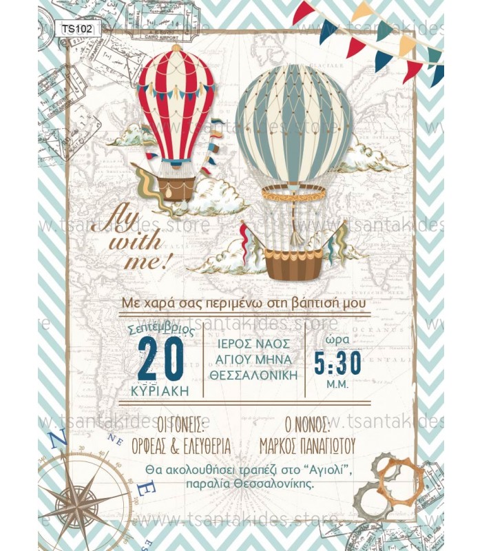 Προσκλητήριο βάπτισης για αγόρι με θέμα το αερόστατο. Η κάρτα του προσκλητηρίου είναι τυπωμένη σε λευκό ματ χαρτί 250γρ. Το προσκλητήριο διαθέτει φάκελο διάστασης 19,5x14,5cm σε χρώμα της επιλογής σας