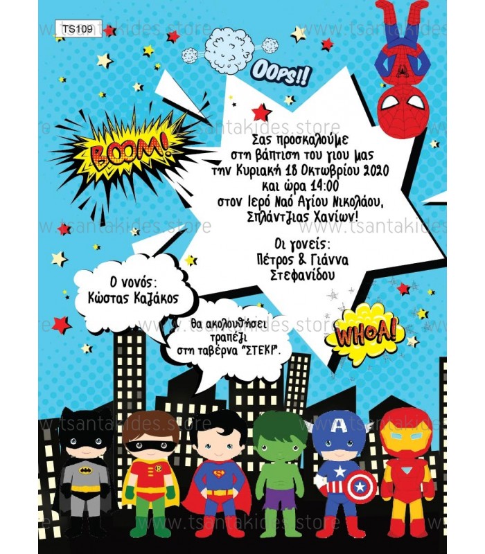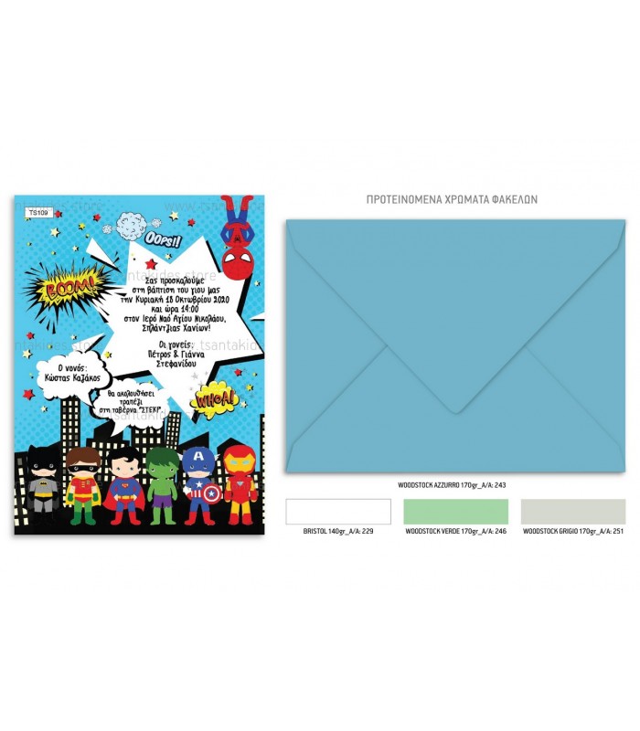 Προσκλητήριο βάπτισης για αγόρι με θέμα super ήρωες. Η κάρτα του προσκλητηρίου είναι τυπωμένη σε λευκό ματ χαρτί 250γρ. Το προσκλητήριο διαθέτει φάκελο διάστασης 19,5x14,5cm σε χρώμα της επιλογής σας