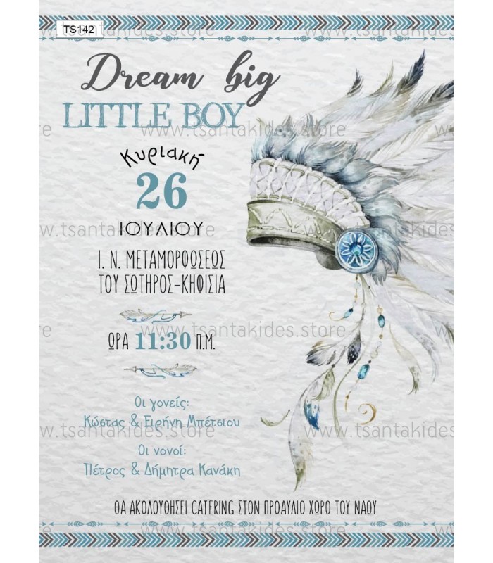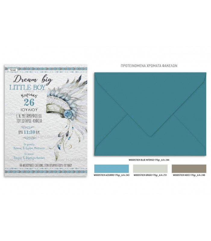 Προσκλητήριο βάπτισης για αγόρι με θέμα ινδιάνος. Η κάρτα του προσκλητηρίου είναι τυπωμένη σε λευκό ματ χαρτί 250γρ. Το προσκλητήριο διαθέτει φάκελο διάστασης 19,5x14,5cm σε χρώμα της επιλογής σας