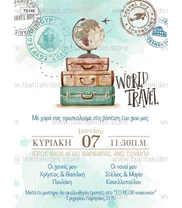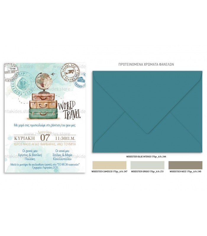 Προσκλητήριο βάπτισης για αγόρι με θέμα travel boy. Η κάρτα του προσκλητηρίου είναι τυπωμένη σε λευκό ματ χαρτί 250γρ. Το προσκλητήριο διαθέτει φάκελο διάστασης 19,5x14,5cm σε χρώμα της επιλογής σας