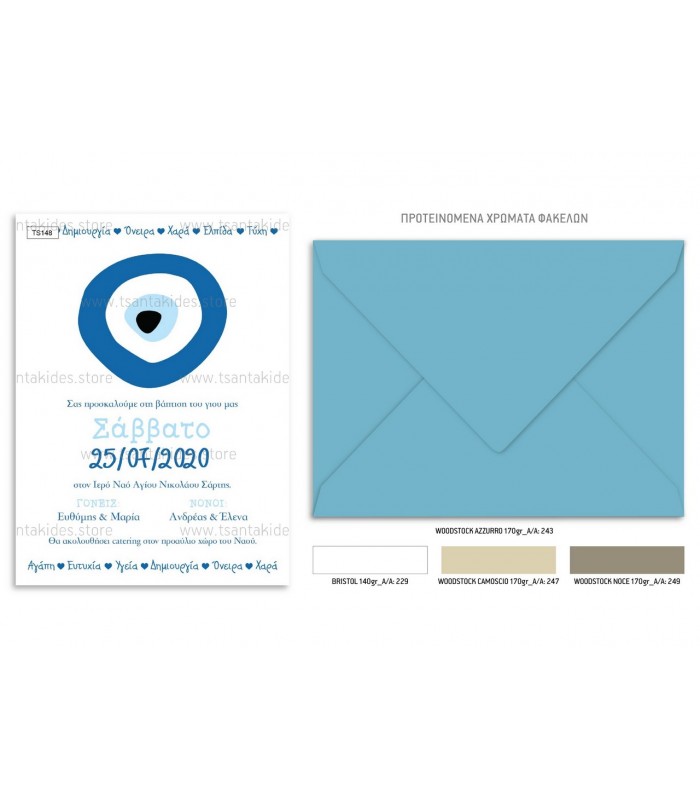 Προσκλητήριο βάπτισης για αγόρι με θέμα μάτι. Η κάρτα του προσκλητηρίου είναι τυπωμένη σε λευκό ματ χαρτί 250γρ. Το προσκλητήριο διαθέτει φάκελο διάστασης 19,5x14,5cm σε χρώμα της επιλογής σας