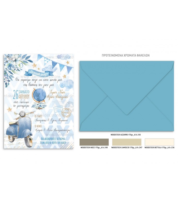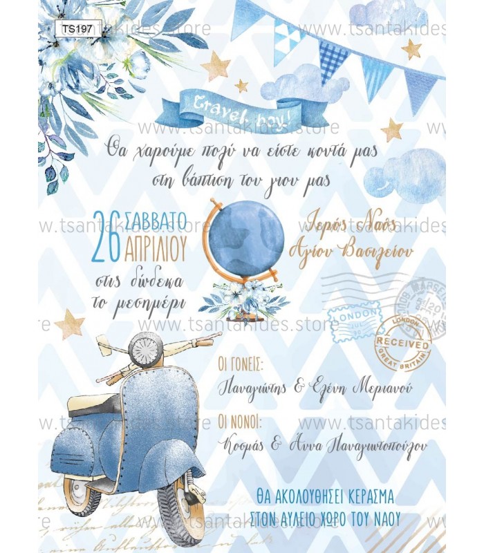 Προσκλητήριο βάπτισης για αγόρι με θέμα travel boy. Η κάρτα του προσκλητηρίου είναι τυπωμένη σε λευκό ματ χαρτί 250γρ. Το προσκλητήριο διαθέτει φάκελο διάστασης 19,5x14,5cm σε χρώμα της επιλογής σας