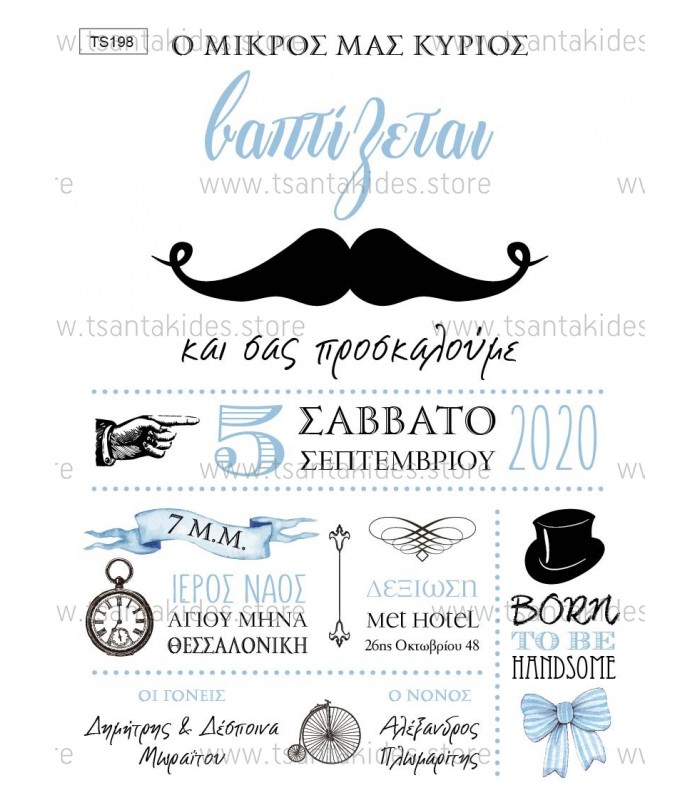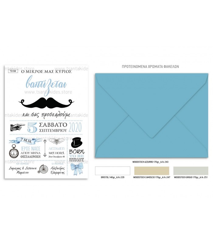 Προσκλητήριο βάπτισης για αγόρι με θέμα μικρός κύριος . Η κάρτα του προσκλητηρίου είναι τυπωμένη σε λευκό ματ χαρτί 250γρ. Το προσκλητήριο διαθέτει φάκελο διάστασης 19,5x14,5cm σε χρώμα της επιλογής σας