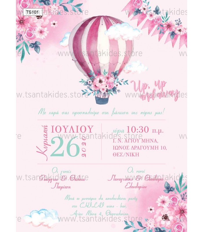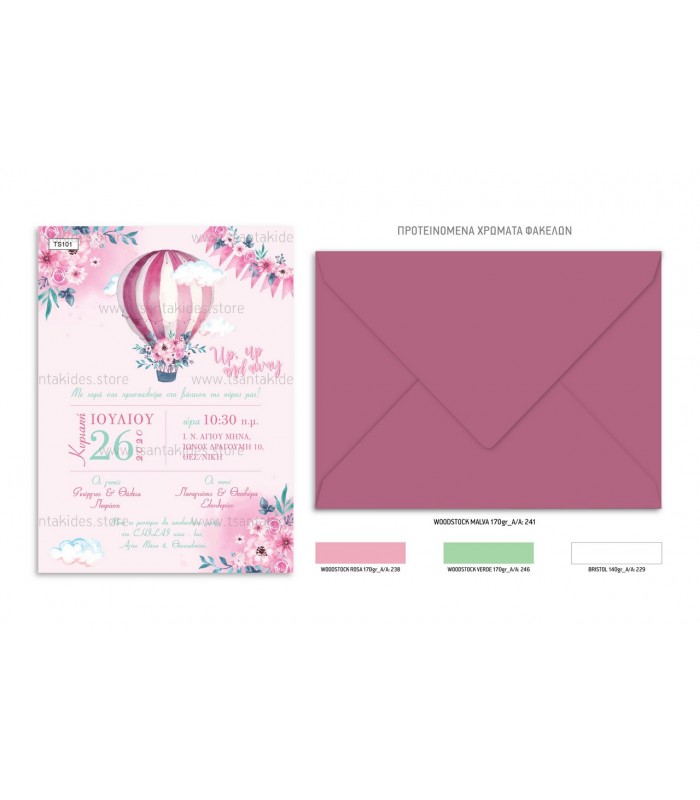 Προσκλητήριο βάπτισης για κορίτσι με θέμα το αερόστατο. Η κάρτα του προσκλητηρίου είναι τυπωμένη σε λευκό ματ χαρτί 250γρ. Το προσκλητήριο διαθέτει φάκελο διάστασης 19,5x14,5cm σε χρώμα της επιλογής σας