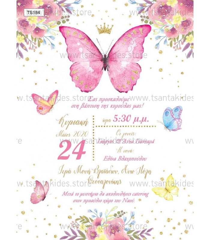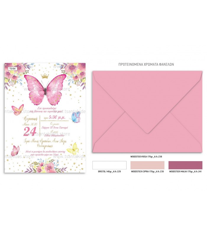 Προσκλητήριο βάπτισης για κορίτσι με θέμα τη πεταλούδα. Η κάρτα του προσκλητηρίου είναι τυπωμένη σε λευκό ματ χαρτί 250γρ. Το προσκλητήριο διαθέτει φάκελο διάστασης 19,5x14,5cm σε χρώμα της επιλογής σας