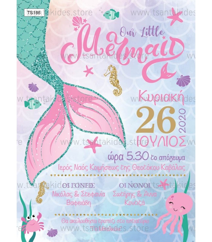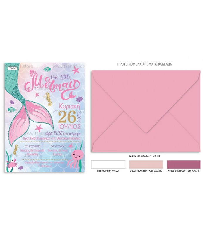 Προσκλητήριο βάπτισης για κορίτσι με θέμα τη γοργόνα. Η κάρτα του προσκλητηρίου είναι τυπωμένη σε λευκό ματ χαρτί 250γρ. Το προσκλητήριο διαθέτει φάκελο διάστασης 19,5x14,5cm σε χρώμα της επιλογής σας