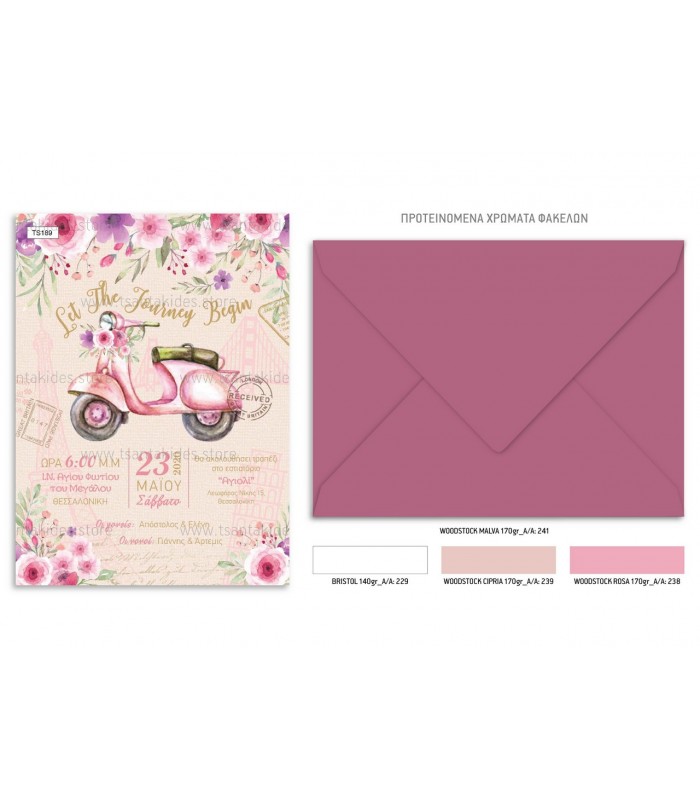 Προσκλητήριο βάπτισης για κορίτσι. με θέμα τη vespa. Η κάρτα του προσκλητηρίου είναι τυπωμένη σε λευκό ματ χαρτί 250γρ. Το προσκλητήριο διαθέτει φάκελο διάστασης 19,5x14,5cm σε χρώμα της επιλογής σας