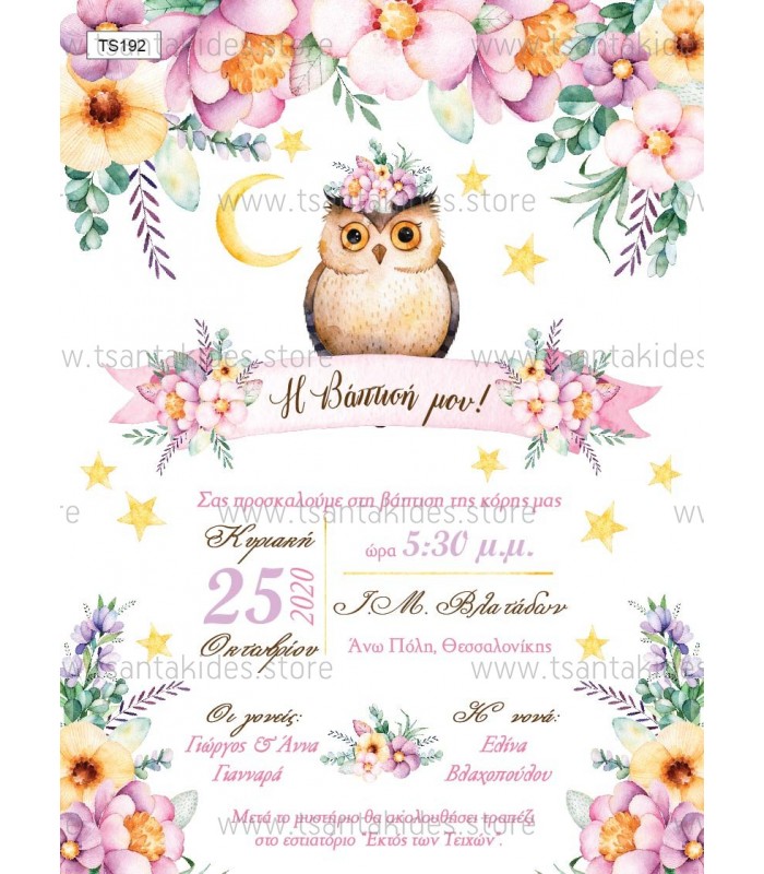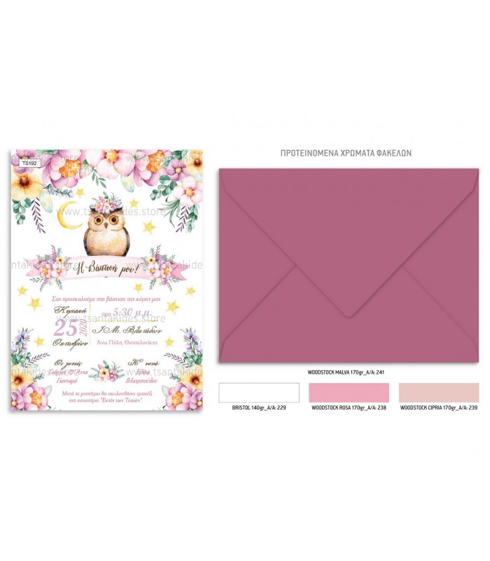 Προσκλητήριο βάπτισης για κορίτσι με θέμα κουκουβάγια. Η κάρτα του προσκλητηρίου είναι τυπωμένη σε λευκό ματ χαρτί 250γρ. Το προσκλητήριο διαθέτει φάκελο διάστασης 19,5x14,5cm σε χρώμα της επιλογής σας