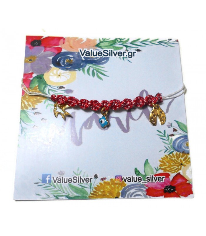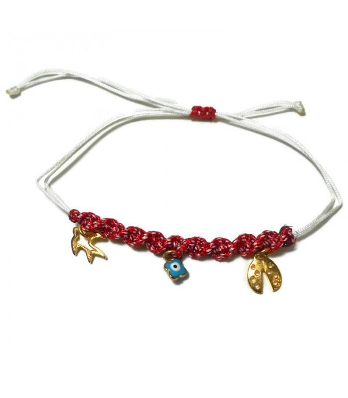 Μαρτάκι βραχιόλι με επίχρυσο χελιδονάκι, πασχαλίτσα και ματάκι.
