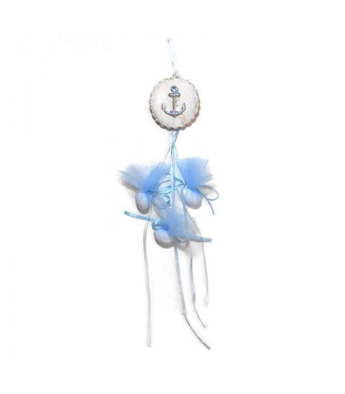 Μπομπονιέρα για αγόρι με θέμα άγκυρα σε κεραμικό μπισκότο, κρεμαστό διακοσμημένο με κορδέλες. Η μπομπονιέρα περιλαμβάνει 3 κουφέτα αμυγδάλου με γεύση Χατζηγιαννάκη και τούλι.