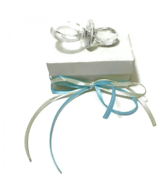 Μπομπονιέρα και για αγόρι και για κορίτσι πιπίλα, επιτραπέζιο γυάλινο σε κουτί πολυτελείας διακοσμημένο με κορδέλες της επιλογής σας. Η μπομπονιέρα περιλαμβάνει 5 κουφέτα αμυγδάλου με γεύση ή 9 πολύχρωμα σοκολατένια κουφετάκια Χατζηγιαννάκη.