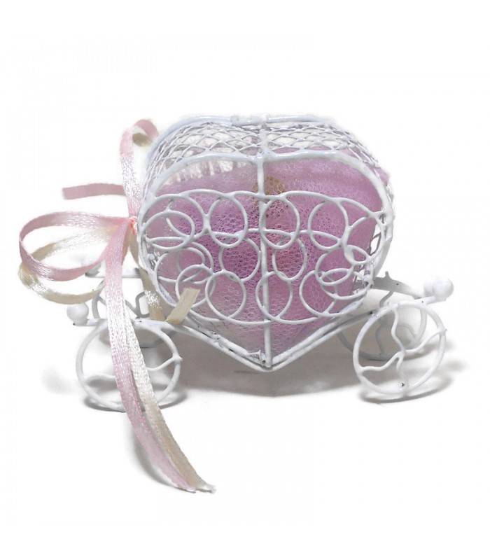 Μπομπονιέρα για κορίτσι άμαξα σε σχήμα καρδιάς. Η μπομπονιέρα περιλαμβάνει 5 κουφέτα αμυγδάλου με γεύση ή 9 σοκολατένια πολύχρωμα κουφετάκια Χατζηγιαννάκη και τούλι.